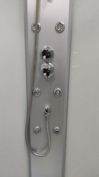 Комплектація: низький піддон з сифоном, розсувні двері, бічні та задні стінки, ручний душ на штанзі, металеві ручки та профіль