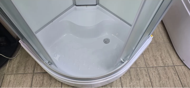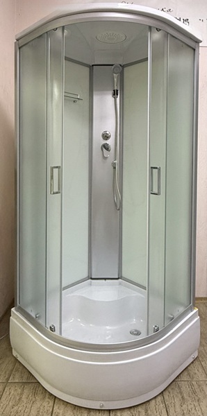 Комплектація: низький акриловий піддон, розсувні двері, бічні передні і задні стінки, ручний душ, металеві ручки, поличка, профіль, посилені подвійні ролики, дах з тропічним душем.