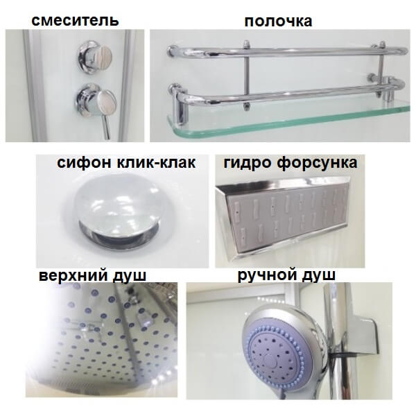 піддон, розсувні двері, бічні передні і задні стінки, ручний душ, металеві ручки, поличка, дах з верхнім душем