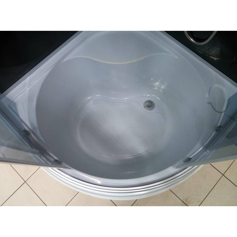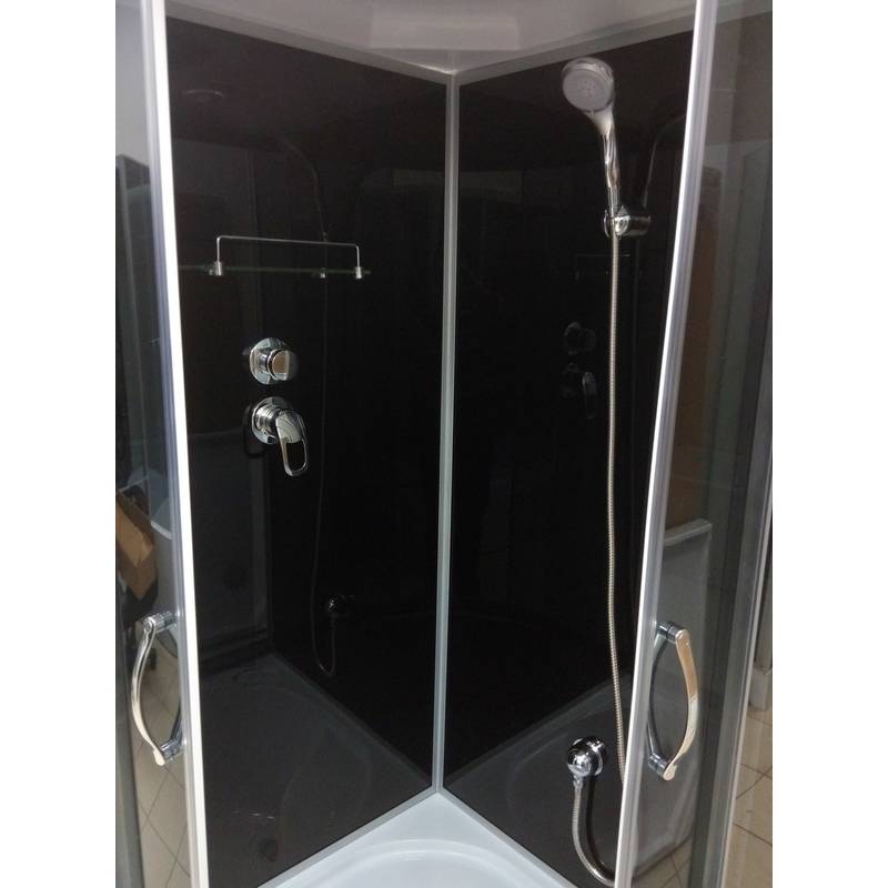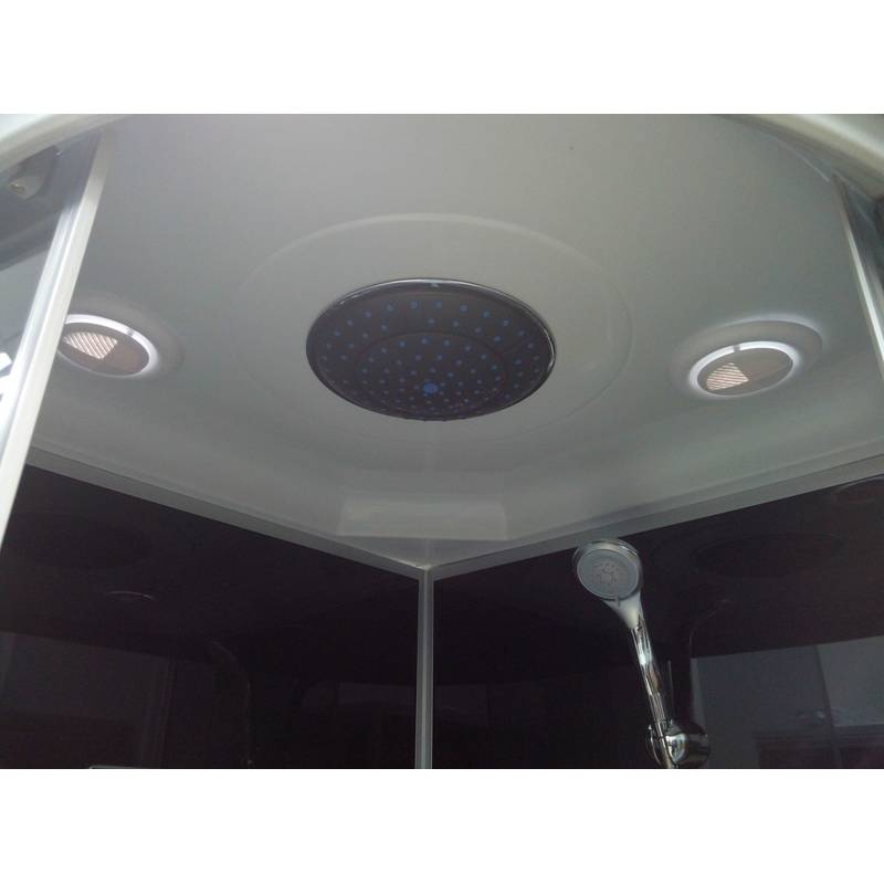 Комплектація: піддон, дах, двері, задні стіни, верхній "тропічний" душ, ручний душ зі стійкою, витяжка, скляна поличка, металеві ручки, подвійні ролики.