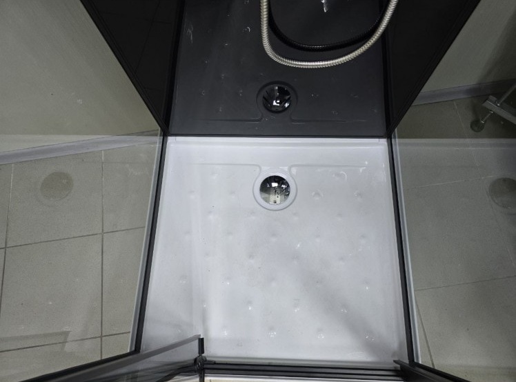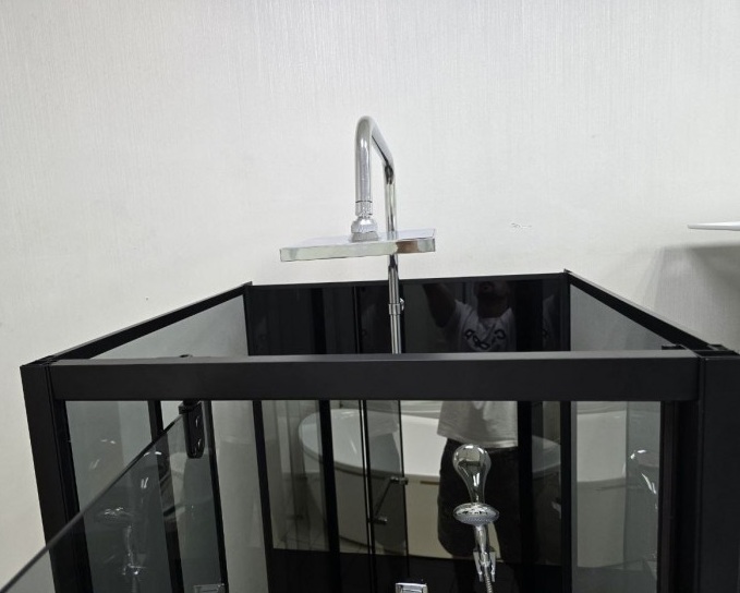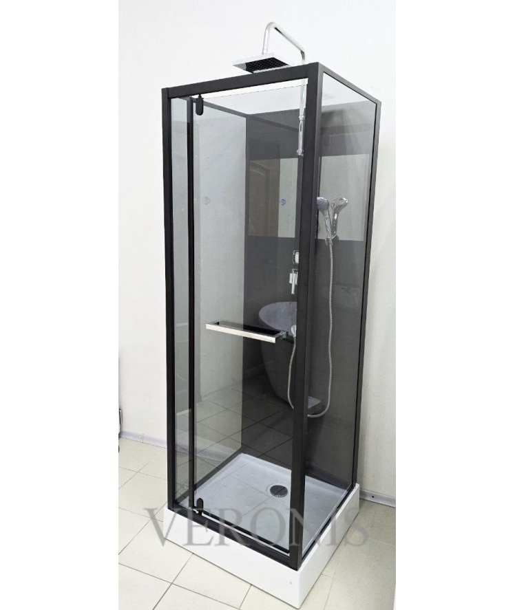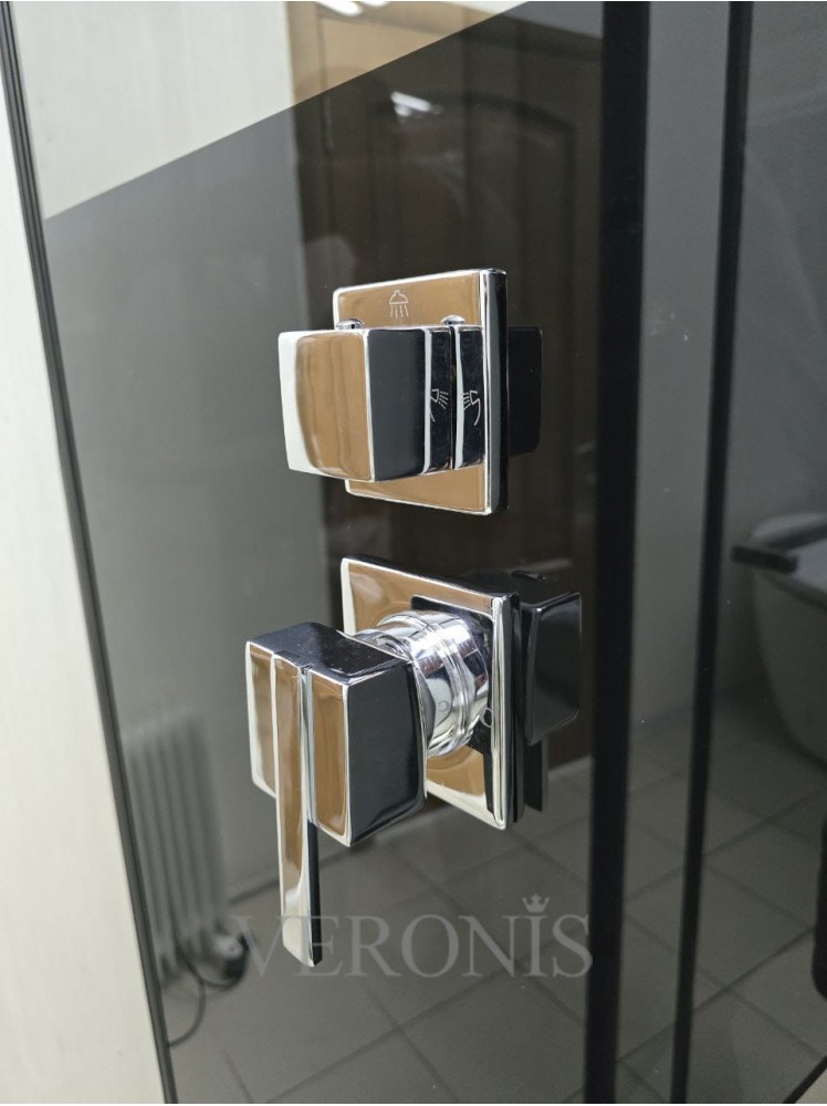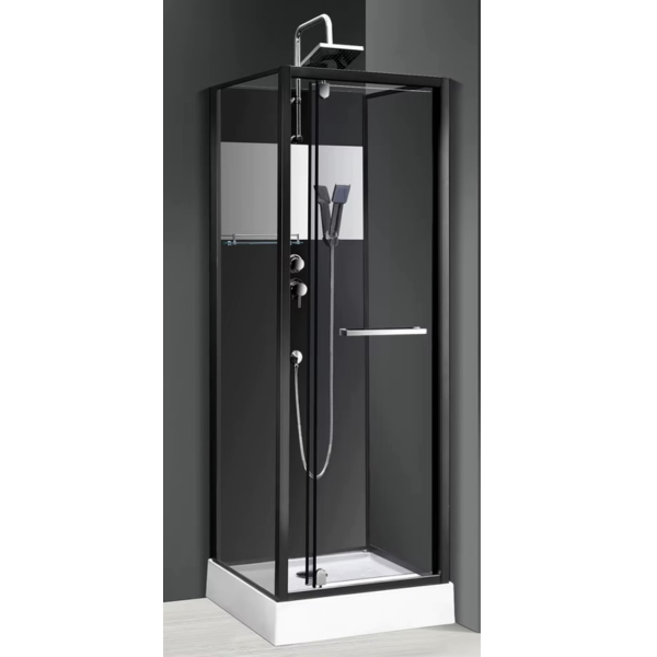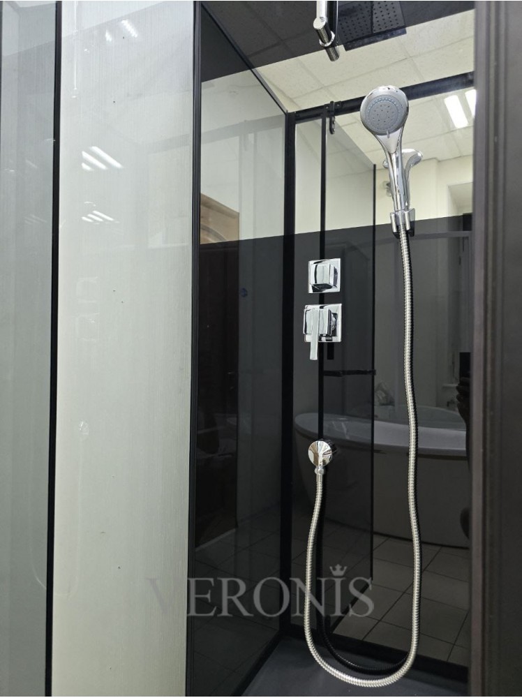 Комплектація: піддон з сіфоном, двері, бічні і задні стінки, ручний душ, металева ручка, дзеркало, чорний профіль, ручний душ, тропічний душ з багатофункціональним змішувачем