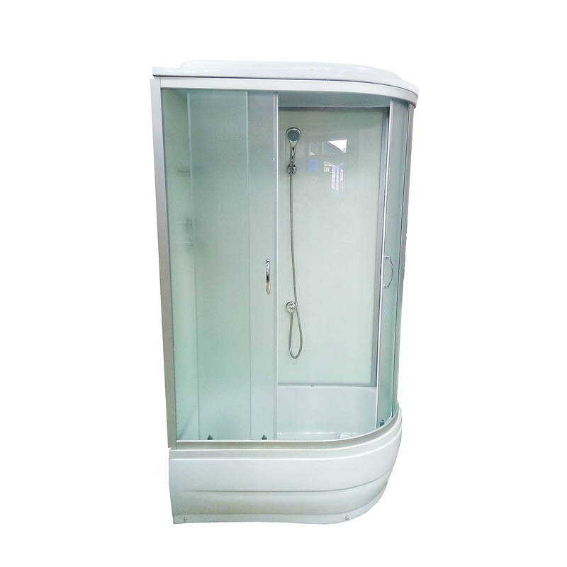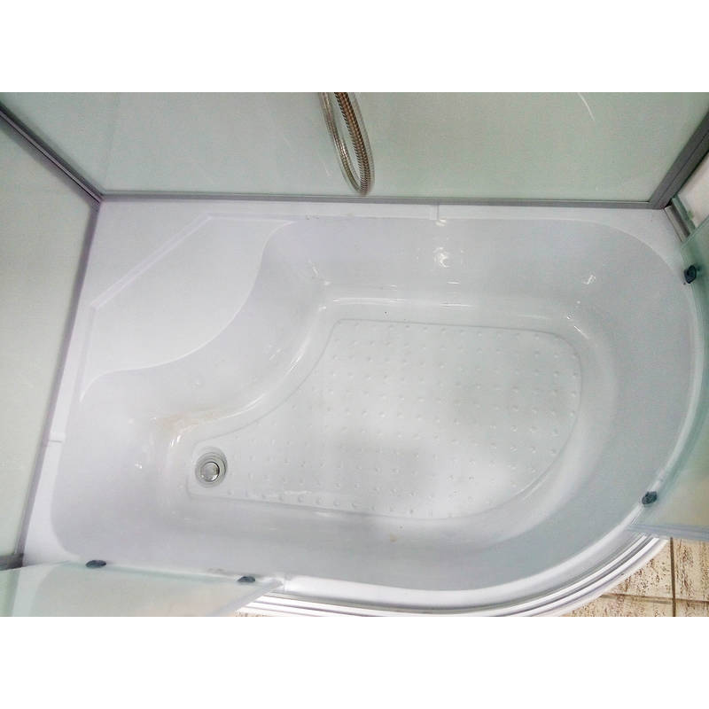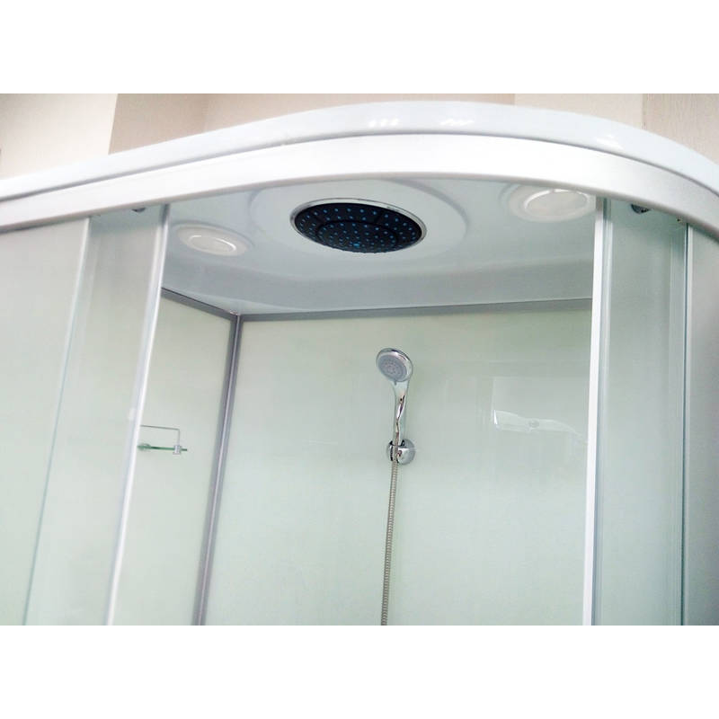 Комплектація: піддон, душові двері, задні стінки, верхній "тропічний" душ, ручний душ зі стійкою, витяжка, скляна поличка, металеві ручки, подвійні ролики.