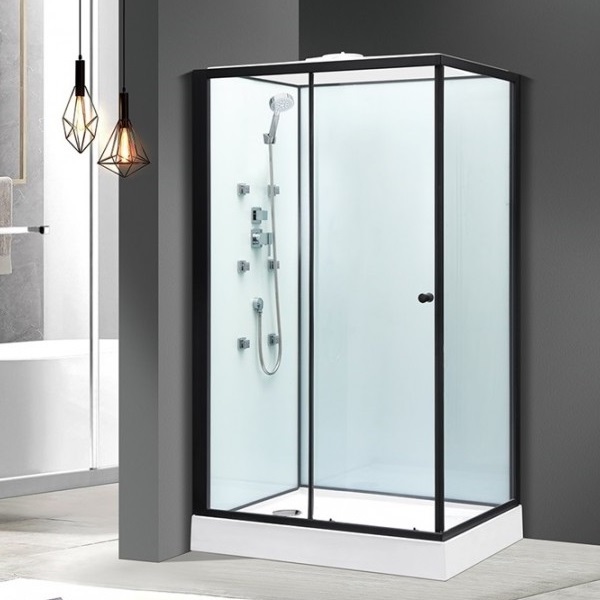 Комплектація: піддон з сифоном, розсувна система на подвійних роликах, бічні та задні стінки, гідромасажні форсунки - 6шт, ручний душ на штанзі, ручка, дах з тропічним душем, змішувач для змішування води та перемикання на лійку або тропічний душ, профіль, ущільнювачі.
