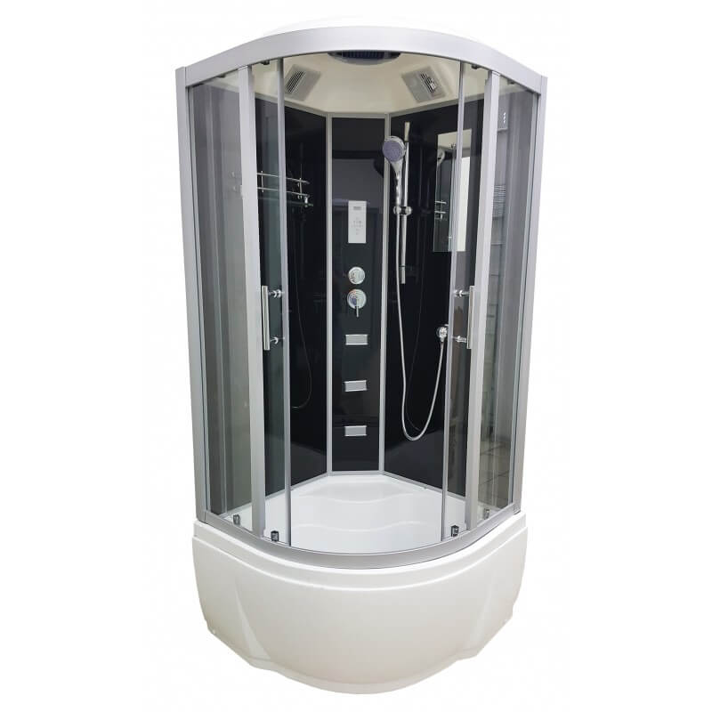 Veronis BV-5-100 GR - це якісний гідромасажний душовий бокс з електронним керуванням з чорними задніми стінками і тонованим склом в габаритному розмірі 100x100x220см зроблений для того щоб перетворити, полегшити і прикрасити інтер'єр Вашої ванної кімнати. Практичність і зручність цього гідробоксу полягає у всіх складових: акриловий піддон з монолітним екраном, який посилено плитою дсп і металевим каркасом, якісна і безвідмовна розсувні система з подвійними роликами, скляна гідромасажна панель з форсунками допоможе Вам одночасно прийняти душ і розслабитися після важкого трудового дня, електронний пульт керування за допомогою которго Ви зможете управляти світлом, витяжкою, радіо, дах з тропічним душем, підсвічуванням і витяжкою, а загартоване скло при розбитті, розсипеться на дрібні безпечні осколки не поранивши Вас. Душовий бокс VERONIS виготовлений на сучасному обладнанні з екологічно чистих матеріалів. Створений італійськими дизайнерами Душовий бокс Veronis це зразок високоякісних інновацій і ідеальне поєднання бездоганної якості, зручності і практичності за розумною ціною.