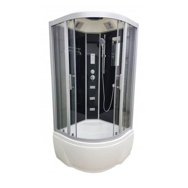 Комплектація: піддон, розсувні двері, бічні передні і задні стінки, гідромасажна панель з пультом керування, зміщувач, ручний душ на штанзі, металеві ручки, дзеркало, поличка, матовий профіль, дах з тропічним душем підсвічуванням і витяжкою.