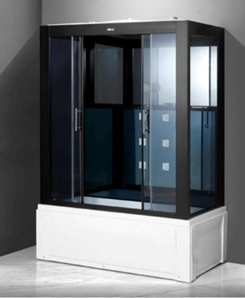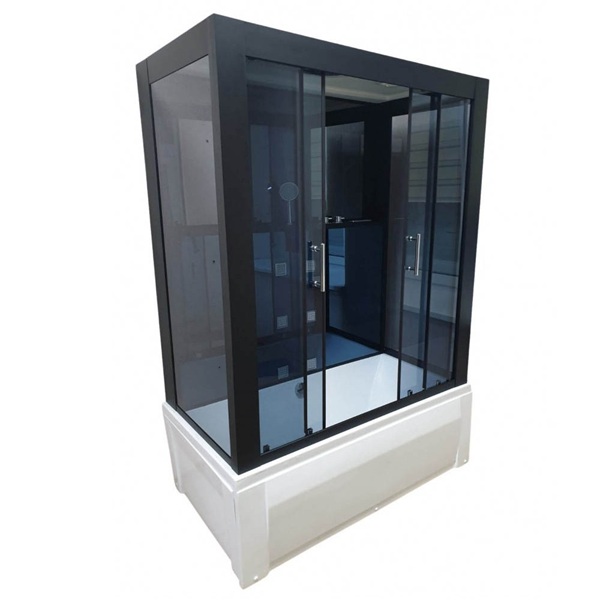 Комплектація: піддон, розсувні двері, бічні передні і задні стінки, гідромасажні форсунки, ручний душ на полиці, металева ручка, поличка з змішувачем і пультом управління, профіль, дах з тропічним душем і витяжкою.