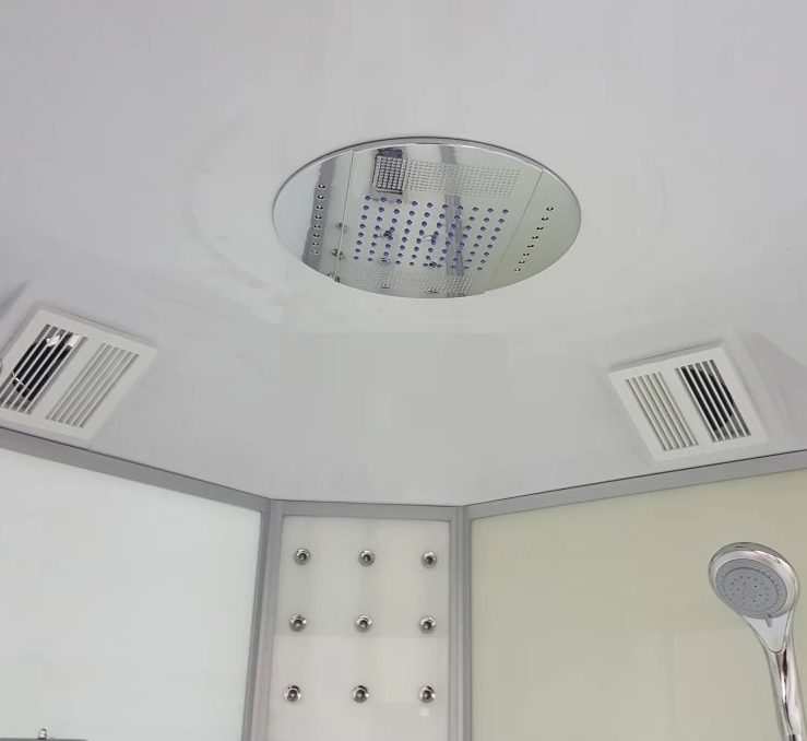 бічні і задні стінки, розсувні дверцята, дах з тропічним душем, ручний душ з тримачем, центральна панель з пультом керування змішувачем та гідромасажними форсунками, підсвічування: верхнє та бокове, витяжка, радіоприймач, ручки, подвійні ролики, піддон акриловий з сифоном, поличка, масажер для ніг, дозатор