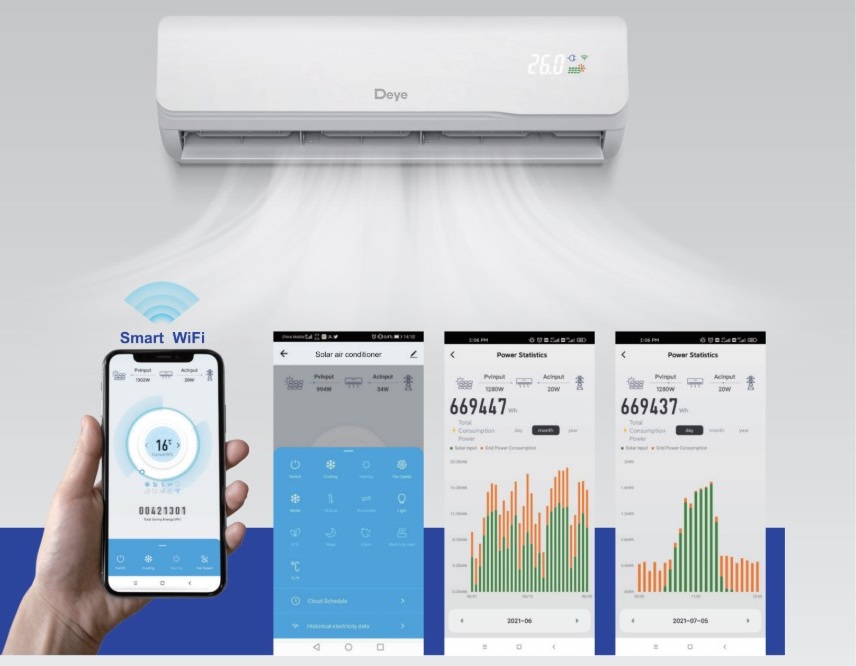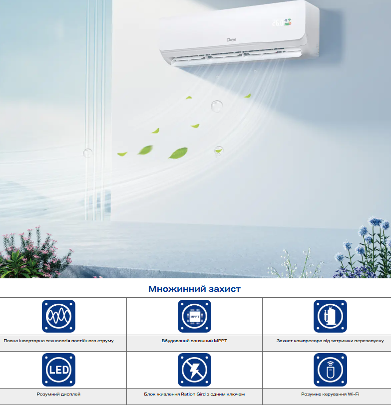 можливістю безпосереднього живлення від сонячної енергії. Настінний кондиціонер Deye ACDC R32 – ідеальне рішення для домовласників, власників офісів, магазинів та інших комерційних об'єктів, які прагнуть значно зменшити витрати на кондиціонування та опалення. Завдяки можливості живлення безпосередньо від фотоелектричних панелей, це чудовий вибір для місць із встановленими або запланованими фотоелектричними установками. Це розумне, екологічне та економічне рішення для тих, хто цінує комфорт, економію та використання відновлюваних джерел енергії.