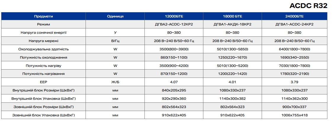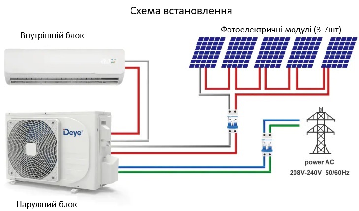 Основні характеристики настінного кондиціонера Deye Hybrid Solar ACDC R32: