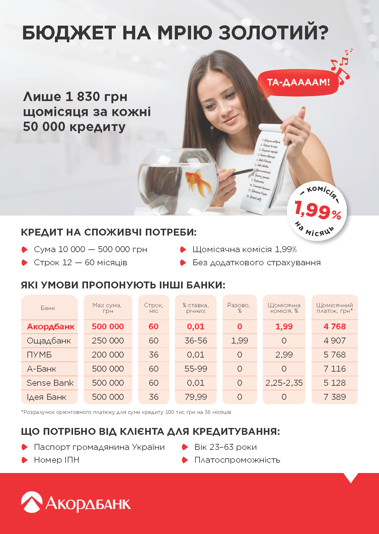 - Щомісячна комісія 1,99% від початкової суми кредиту