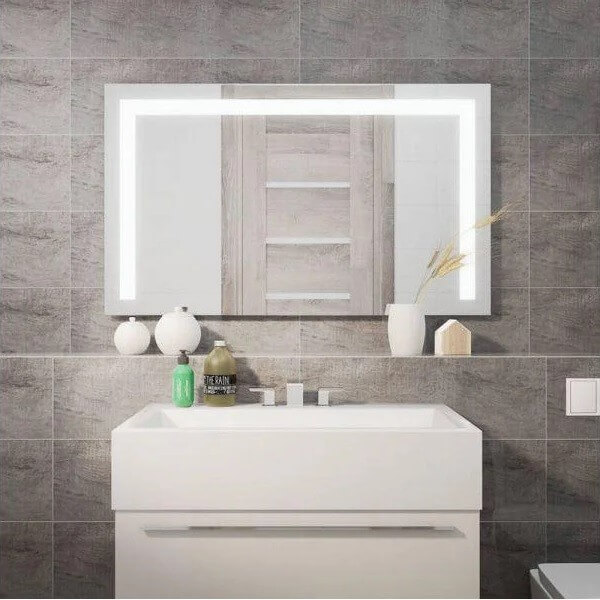 Модель зеркала ТРИО очень красиво будет смотреться в интерьере Вашей ванной комнаты, прямоугольные линии с лед подсветкой с вертикальными полосками по краям и горизонтальной полосой станет отличным элементом любого помещения, упорядочит пространство и придаст грациозный вид. Прямые формы данного зеркала, будут отлично сочетаться с похожими элементами интерьера ванных принадлежностей и аксессуаров.