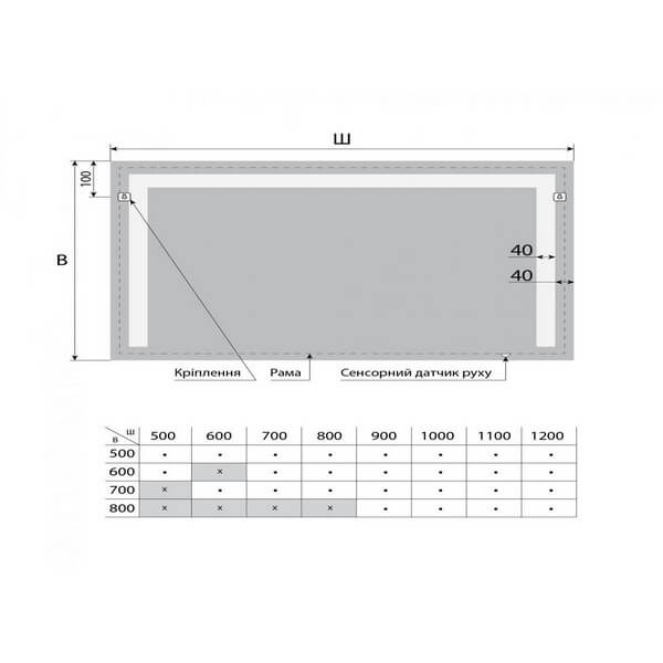 Цена указана в размере 50х50см, для стандартной комплектации изделия (зеркало, сенсор включения / выключения подсветки LED, который реагирует на движение)
