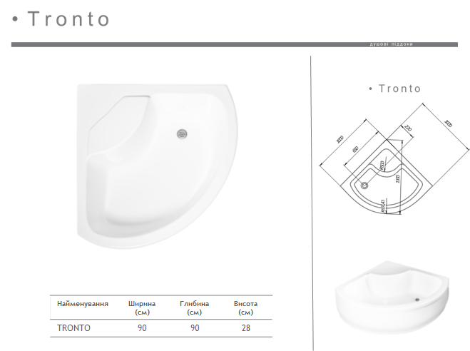 Акриловий кутовий напівкруглий глибокий душовий піддон TRONTO 100x100x28У виробництві наших піддонів ми використовуємо технологію литого АКРИЛу. Дана технологія, на відміну від штампування акрилового листа, дозволяє зробити вироби більш якісними та міцними, а також має ряд переваг:- антибактеріальний шар покриття;- легкість (вага піддону до 15кг);- міцність (стійкість до подряпин, фарбників, кислот);- стійкість до механічних ушкоджень;- ремонтопригоднісь;- простоту в установці;Характеристики:Матеріал: Рідкий акрил «Lucite» (Англія)Колір: БілийГабарити: Довжина: 100см. Ширина: 100см Глибина: 28см. Висота: 40см.Колір може будь яким з палітри RAL - під замовлення.