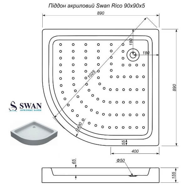 Душовий акриловий піддон RIKO від української компанії SWAN виготовлений з високоякісного рідкого литтєвого акрилу італійської компанії ItalBeit SRL із застосуванням інноваційного методу формування, який застосовується при виробництві корпусів катерів і яхт преміум-класу. Товщина стінки виробу становить 6-7 мм, з них - товщина акрилового кулі - 1-1,5 мм, товщина армуючого шару - 5-6 мм. Зовнішній силовий шар піддону армований скловолокном від українського виробництва з застосуванням безпечного для людини і навколишнього середовища затверджувача. Дно піддону посилено плитою ДСП з великою кількість ребер жорсткості. Безпека підтверджується висновком санітарно - епідеміологічної експертизи № 05.03.02-04 / 42095.