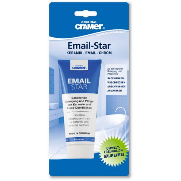 Більшість засобів для очищення ванн містять сильні кислоти, необхідні видалення вапняних відкладень. Але оскільки звичайна сантехнічна емаль не є кислотостійкою протягом тривалого часу, при постійному застосуванні таких засобів виникають проблеми: поверхня стає матовою, емаль ушкоджується! Email-Star відновлює колір, усуває вапняний наліт та сильні забруднення, не роз'їдаючи поверхню. Ефективність засобу пов'язана з використанням комбінації певних поверхнево-активних речовин та поліруючого компонента, підібраного з урахуванням твердості кераміки та емалі. Паста не дратує шкіру, не містить кислот і є екологічно чистою. Для постійного дбайливого очищення та догляду – щоб надовго зберегти зовнішній вигляд вашої сантехніки.