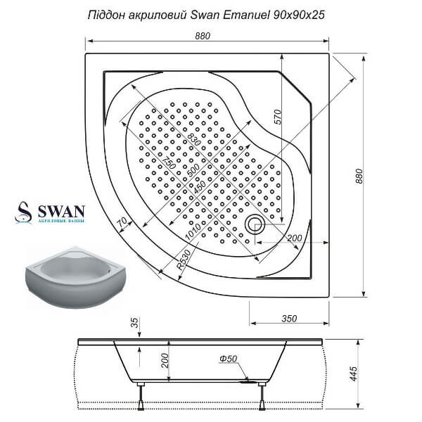 Душевой акриловый поддон EMANUEL 90 от украинской компании SWAN изготовлен из высококачественного жидкого литьевого акрила итальянской компании ItalBeit SRL с применением инновационного метода формования, который применяется при производстве корпусов катеров и яхт премиум-класса. Толщина стенки изделия составляет 6-7 мм, из них - толщина акрилового шара - 1-1,5 мм, толщина армировочного шара - 5-6 мм. Внешний силовой слой поддона армирован стекловолокном от украинского производства с применением безопасного для человека и окружающей среды отвердителя. Дно поддона усилено плитой ДСП с большим кол-во ребер жёсткости. Безопасность подтверждается заключением санитарно - эпидемиологической экспертизы № 05.03.02-04 / 42095.