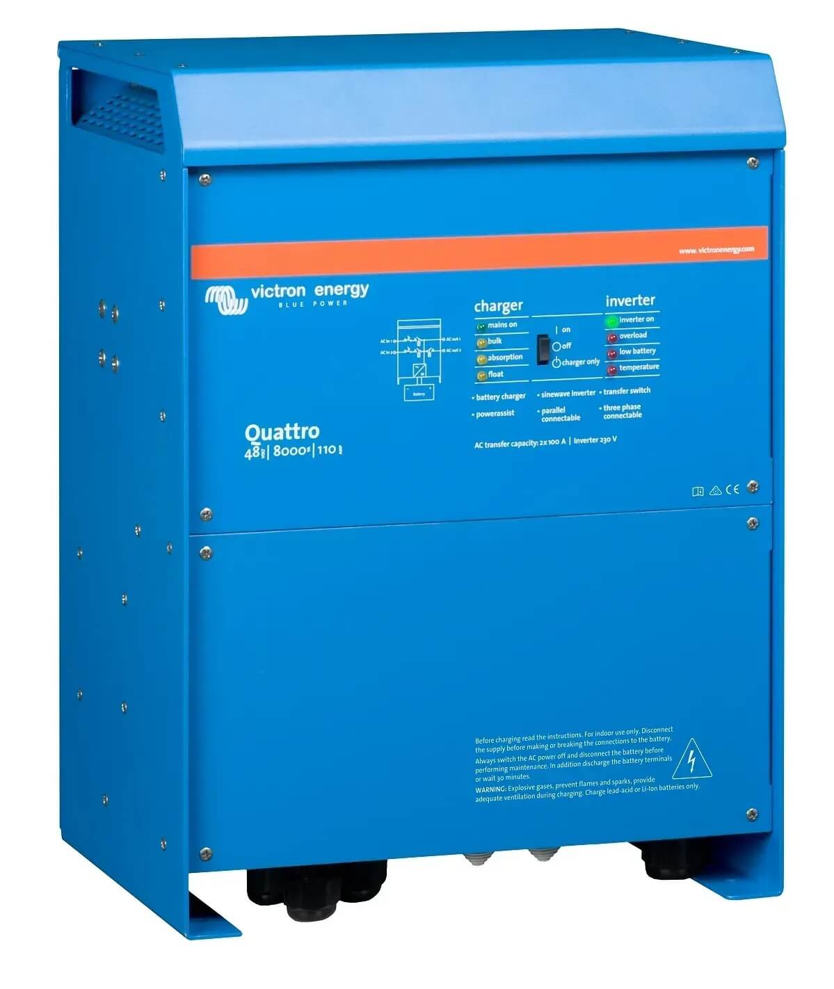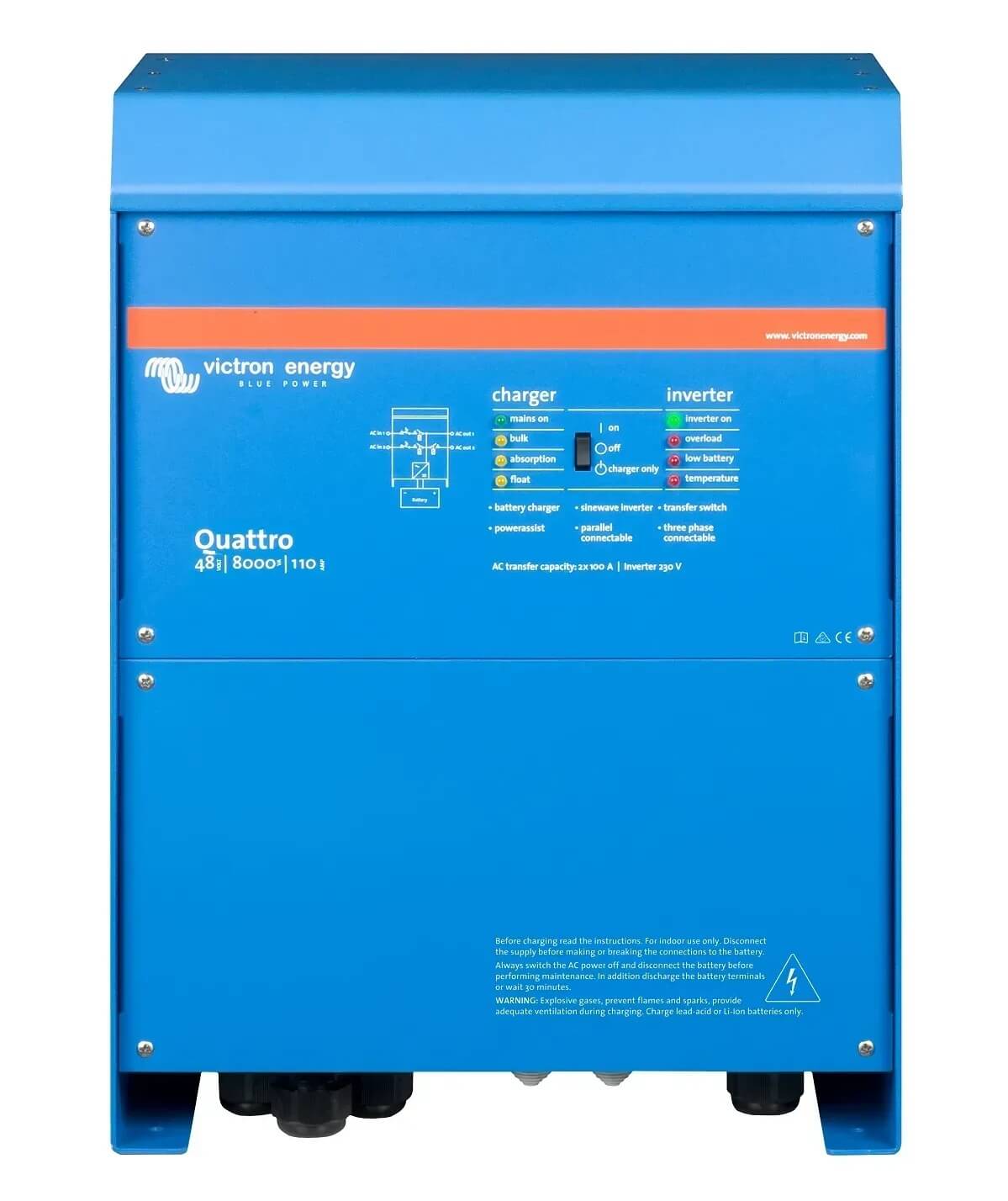 Quattro 48/8000/110-100/100 — це справжній флагман серед гібридних інверторів Victron Energy. Розрахований на професійне промислове застосування, він здатен забезпечувати до 8 000 ВА потужності з вбудованим зарядним пристроєм 110 А, двома незалежними AC-входами та повною підтримкою автономних, гібридних та мережевих систем зберігання енергії (ESS).