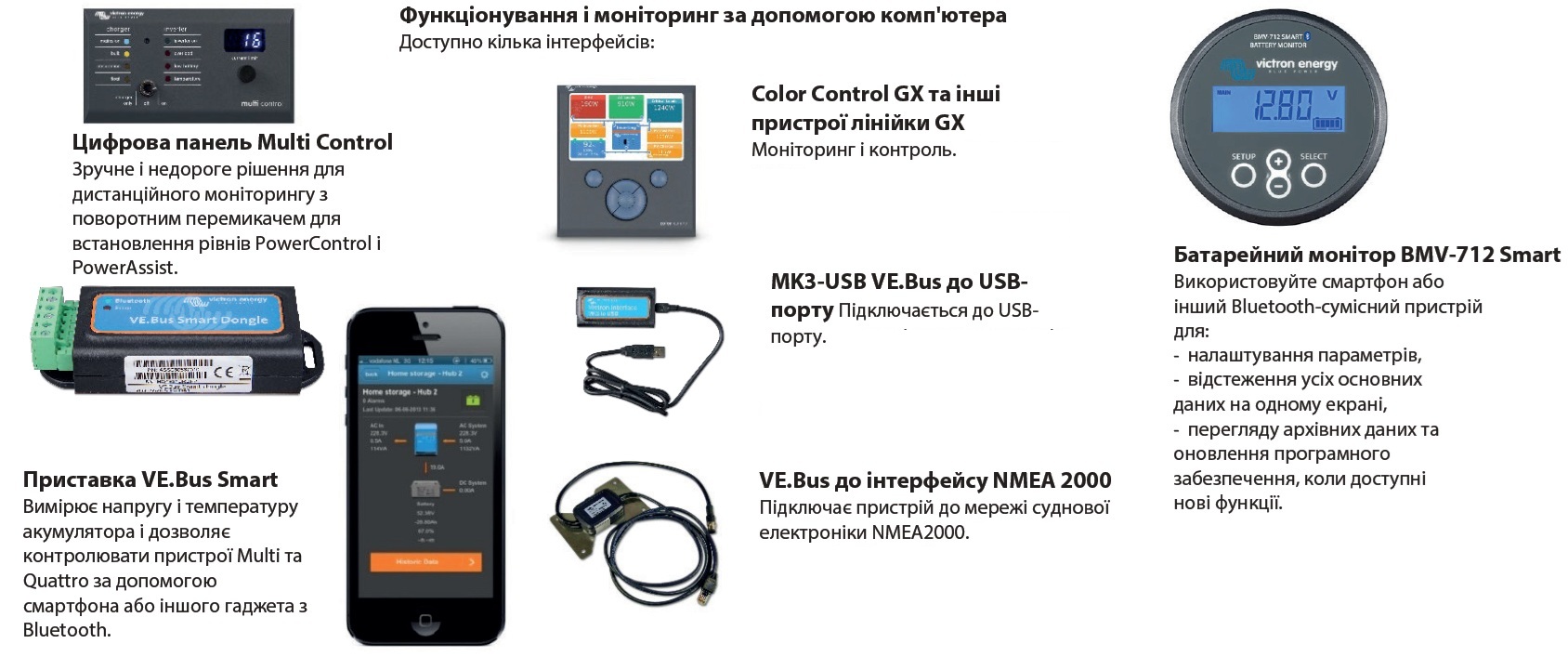 Контролер GX – розширює функціонал інвертора завдяки портам VE.Can та VE.Direct, Ethernet, Bluetooth, WiFi та USB, які дозволять підключити систему до мережі інтернет, хмарного сервісу VRM в т.ч. всі інші модулі системи (MPPT-контролери, вимірювальні шунти, акумуляторні LiFePO4 батареї з BMS і все це дуже зручно налаштовувати, контролювати та відслідковувати прямо з телефону у будь-якій точці світу).
