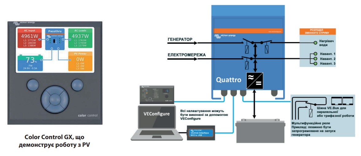 - VE.Bus – Паралельна/трифазна робота, підключення до контролерів GX, налаштування