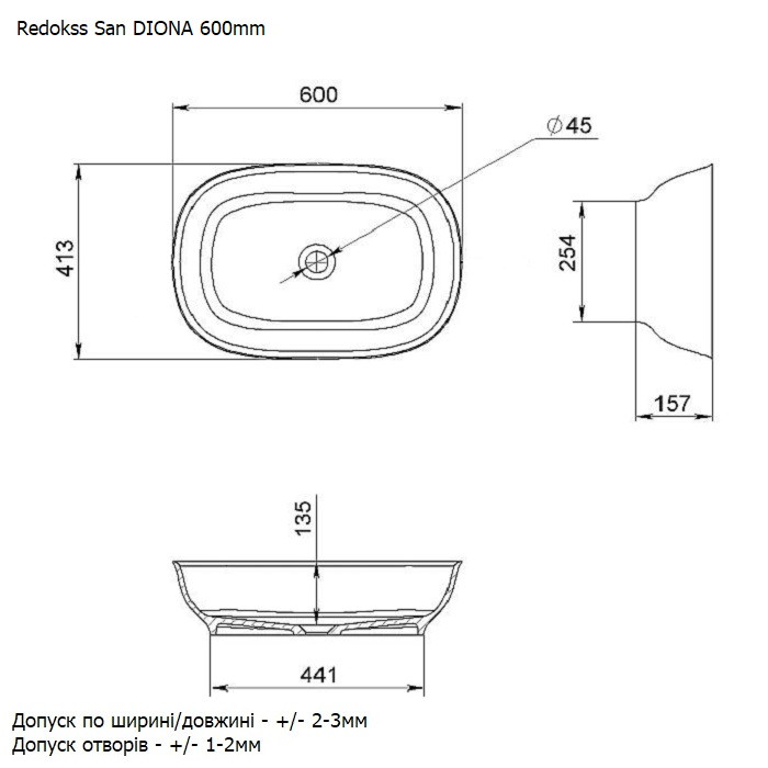 Накладной умывальник Redokss San DIONA из литого мрамора — стильное и практичное решение для современной ванной.Элегантная глубокая форма чаши и гладкая глянцевая поверхность легко впишутся в любой интерьер: от минимализма до классики.Литой мрамор прочен, устойчив к влаге и прост в уходе — сохраняет первозданный вид на годы.Идеален для накладного монтажа на тумбу или столешницу. Преимущества умывальников из литого мрамора: антибактериальный слой покрытия; прочность (стойкость к царапинам, красителям, кислотам); устойчивость к механическим повреждениям; подлежит ремонту.