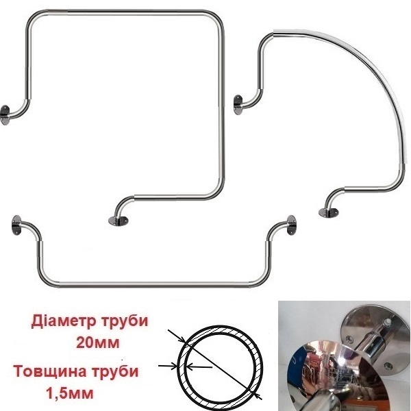 При замовленні вкажіть будь ласка розміри та форму ванни (для асиметричної ванни вкажіть крок закруглення - див. фото) та остаточна вартість буде скоригована залежно від розміру карнизу!!!Карниз для вашої ванни або піддону буде виконаний з якісного нержавіючого металу діаметром труби 20 мм (товщина стінок не менше 1,5 мм) Сталь 201.